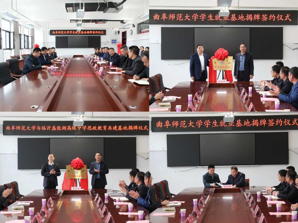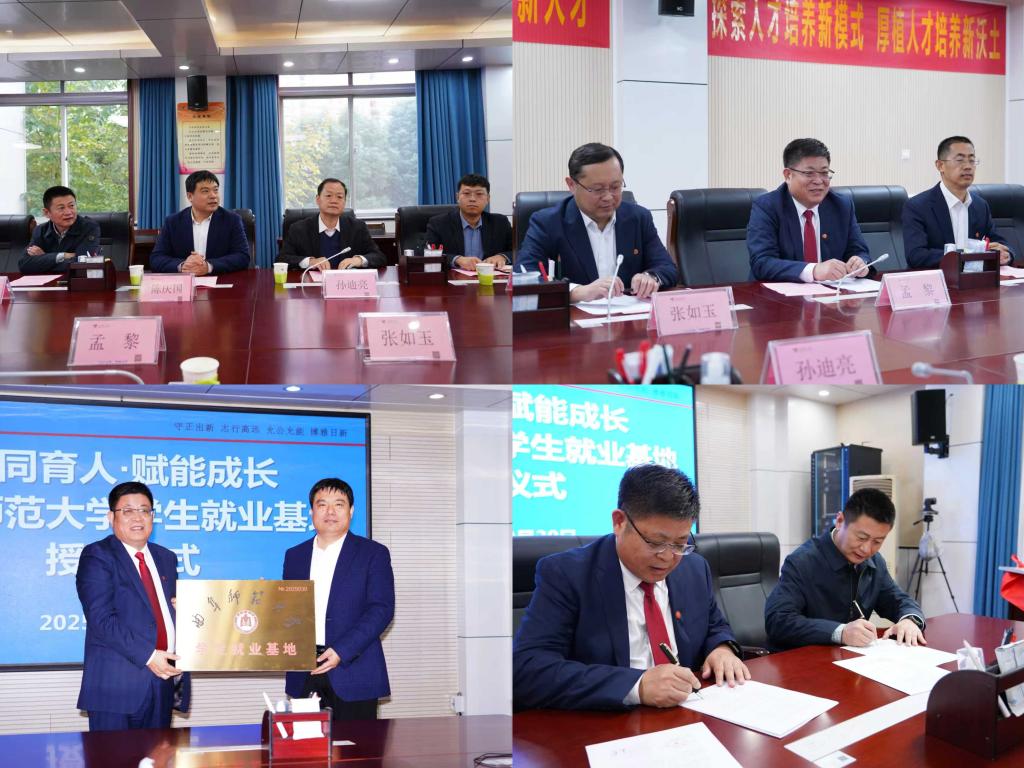 在交流座谈期间,双方围绕深化校企合作、推动产教融合、促进教育高质量发展等议题展开深入交流,探讨了如何通过跨学科合作与资源共享推动教育创新,以更好适应社会快速发展的需求。孙迪亮介绍了学院在办学历史、办学条件、人才培养、师资队伍、实践教育等方面的举措,结合当前形势,他表示要积极推进大中小一体化教育改革,深化与周边地区合作,拓展师范生的实践与就业渠道,致力于培养更多优秀教育人才,服务地方教育发展。随后,陈庆国、孙迪亮分别与山东外国语职业技术大学、日照康养职业学院、山东美丽源电子商务有限公司、日照航海工程职业学院、临沂城市职业学院、临沂盛能湖高级中学及临沂第四中学负责人为“曲阜师范大学学生就业基地”揭牌,并与临沂盛能湖高级中学为“曲阜师范大学思政教育共建基地”揭牌。姜振栋与各单位负责人签署《曲阜师范大学学生就业基地》协议,双方合影留念。