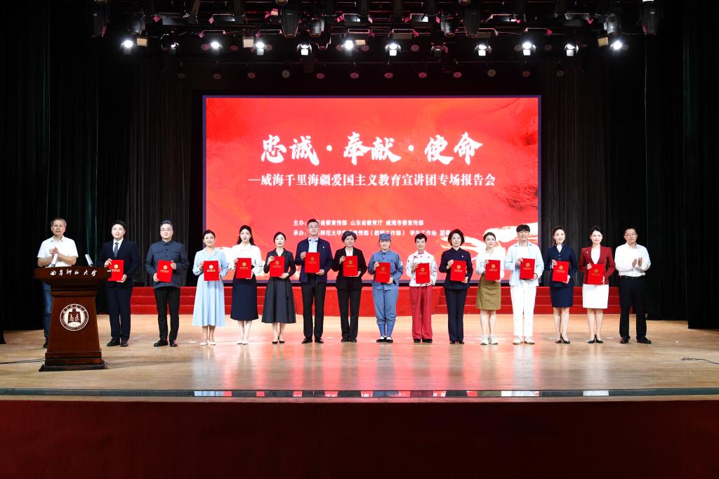 党委宣传部讯 9月17日,曲阜师范大学邀请威海千里海疆爱国主义宣讲团走进学校,开展了“忠诚·奉献·使命”主题宣讲暨大中小学思政课一体化研习会,校地携手上好了一堂“思政大课”。学校党委副书记刘涛,党委常委、宣传部部长孙祥广出席活动。